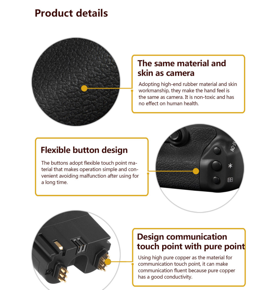 This stable and ergonomically-designed battery grip offers more useful functions. It can be used with 1 or 2pcs of LP-E6/LP-E6N batteries. It is equipped with shutter button in vertical position, main drive plate and other buttons that can make the operation the same whatever shooting in vertical or horizontal position..